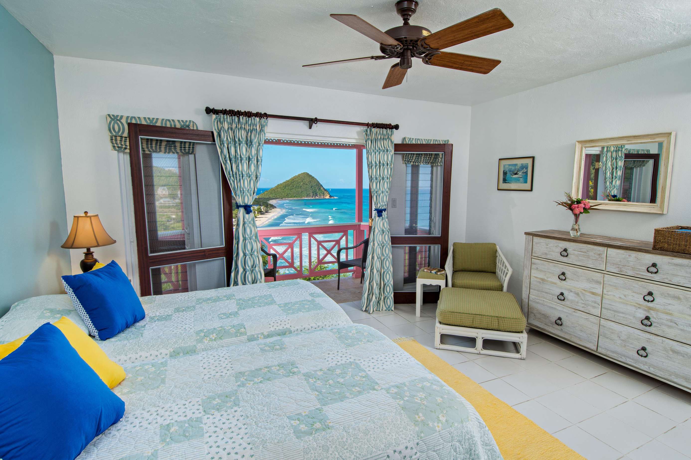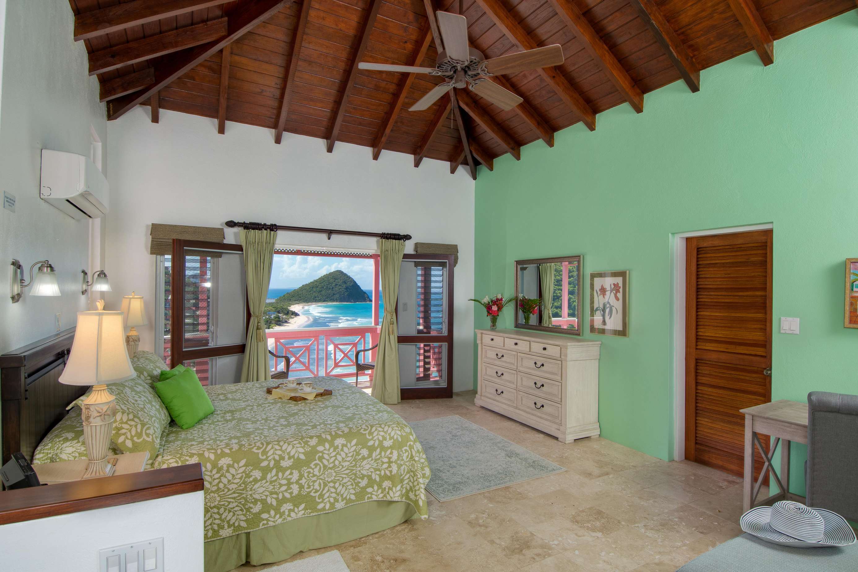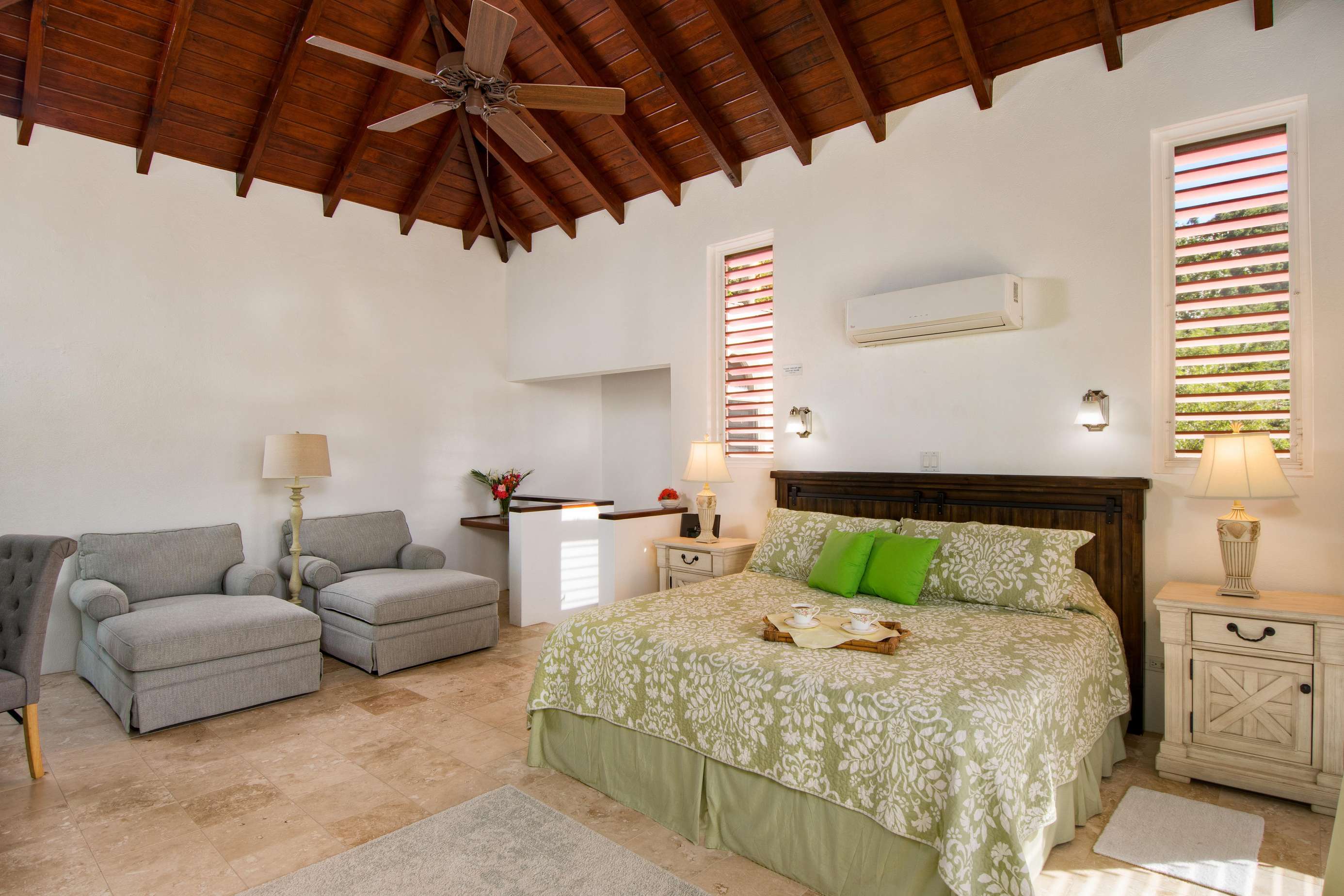 From the moment you arrive through the villa’s elegant courtyard entrance, you’re welcomed into a space that feels both expansive and intimate. The home features five spacious, airy bedrooms, each with en-suite bathrooms and private balconies that capture the trade winds and stunning ocean vistas.